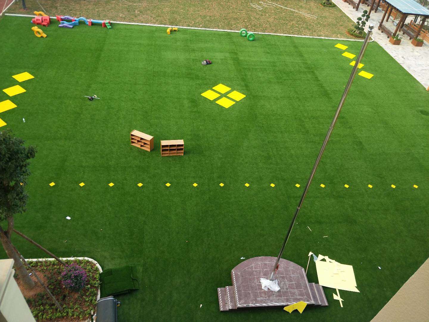 福建漳州市南靖縣兒童公園游樂園選用的綠達(dá)產(chǎn)品來鋪裝,綠色的人造草和黃色的人造草鋪在一起比較和諧,視覺上也飽滿,可以供小朋友在上面隨意玩耍。